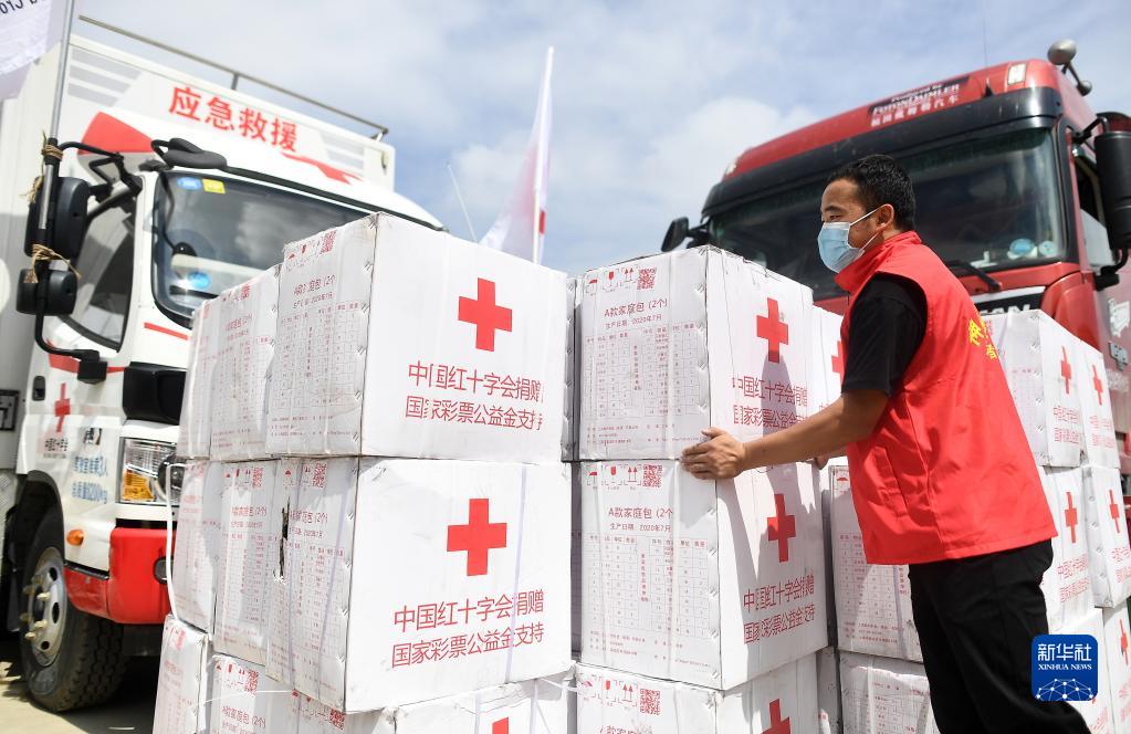 8月19日,青海省红十字会志愿者在大通一中临时安置点整理救灾物资准备发放。