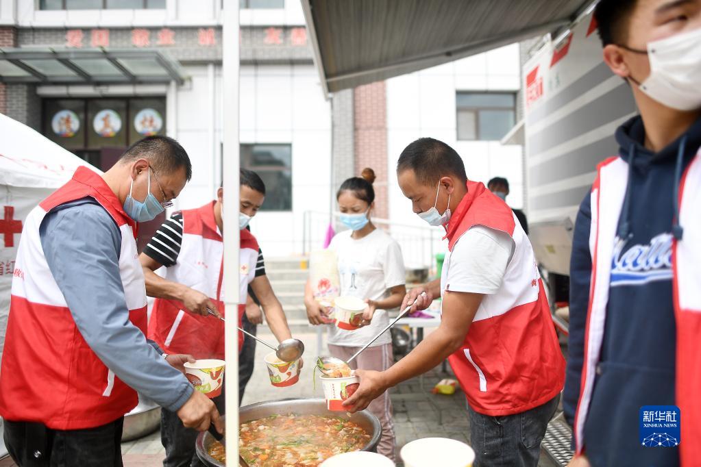 8月19日,青海省红十字会工作人员在大通一中临时安置点为受灾群众准备午餐。