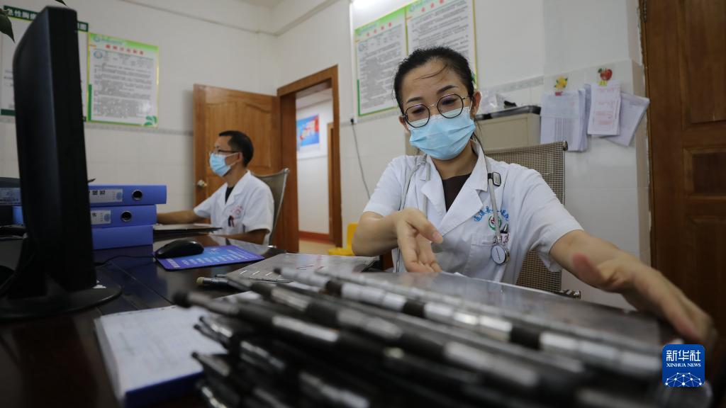李秋菊(右)在整理患者档案(8月17日摄)。