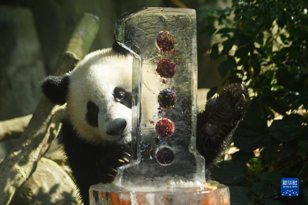 8月12日,在新加坡河川生态园,大熊猫幼崽叻叻在自己的一岁生日庆祝活动上品尝冰块蛋糕。