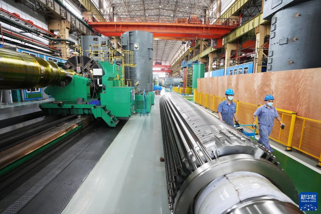 8月19日,工人从哈电集团哈尔滨电机厂有限责任公司的车间内经过。新华社记者 王建威 摄