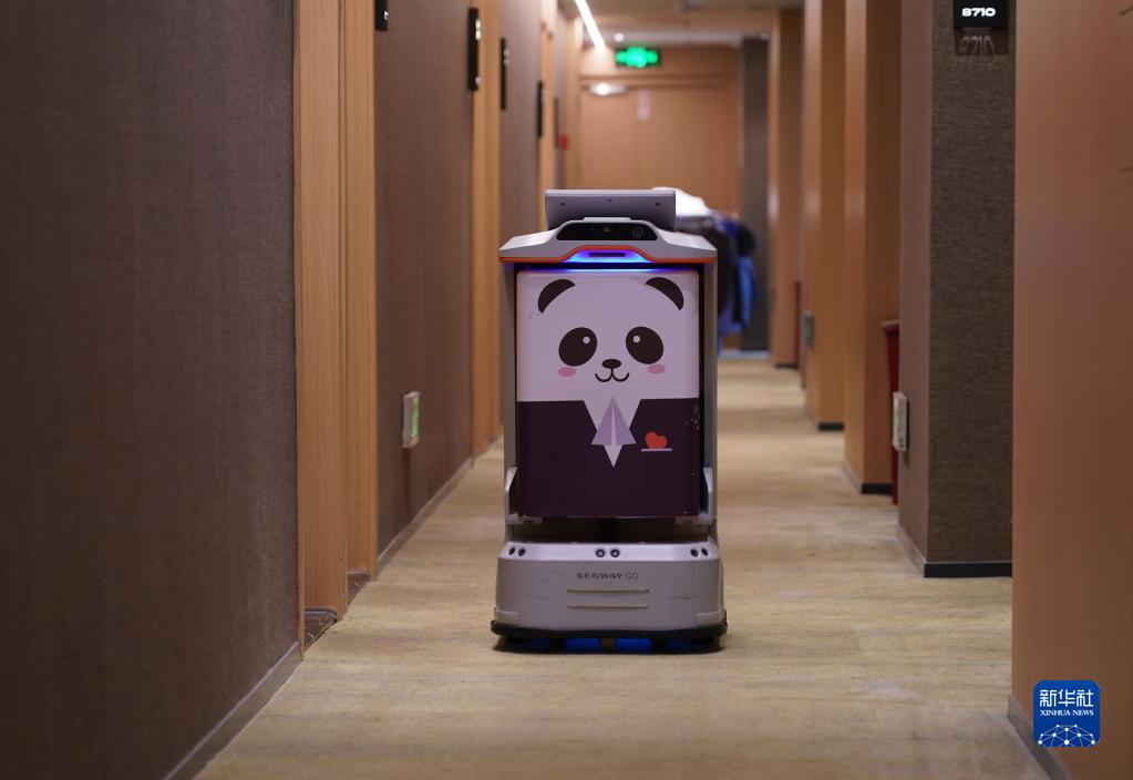 在位于北京市朝阳区的秋果酒店亚运村国家会议中心店,服务机器人在配送物品(8月13日摄)。