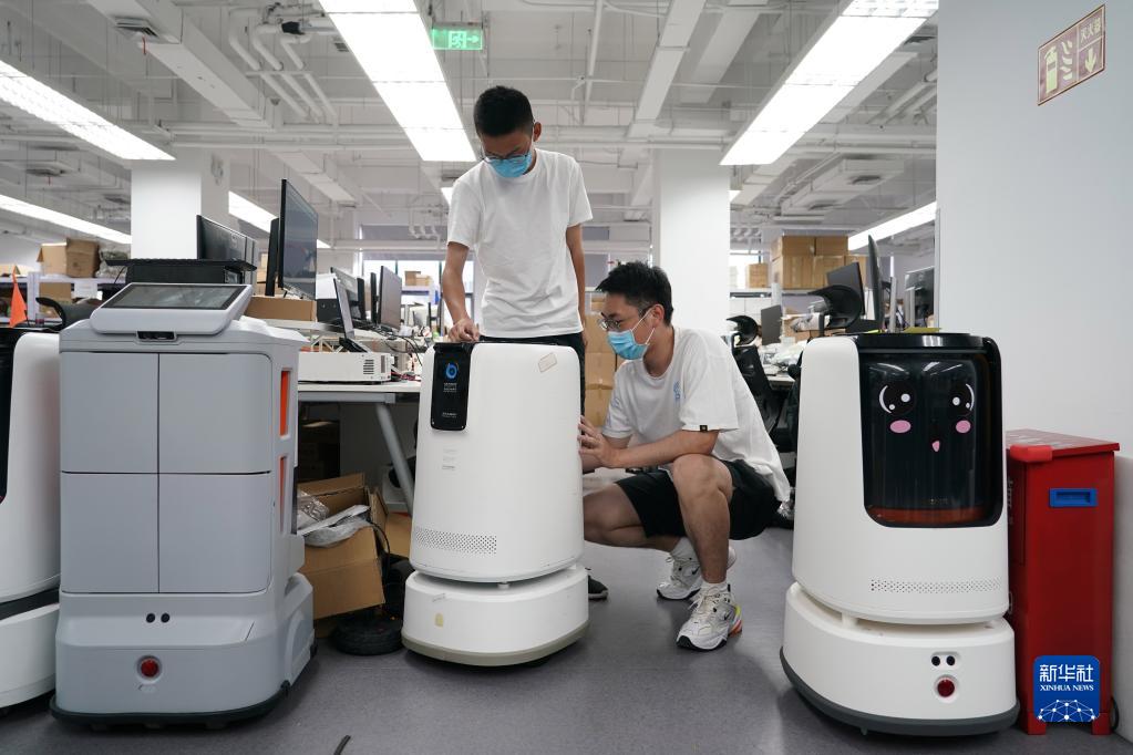 在北京市海淀区中关村东升科技园,一家商用机器人公司的工作人员在调试服务机器人(8月15日摄)。