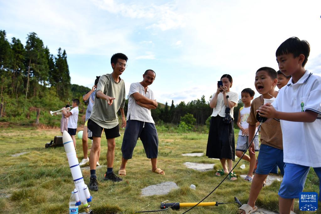8月20日,孩子们在志愿者的带领下体验“火箭发射”。