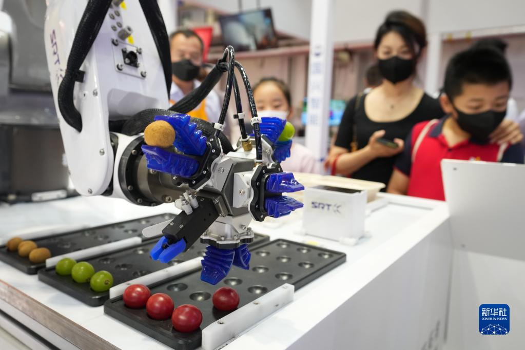 参观者在2022世界机器人博览会观看软体机器人果蔬分选平台演示(8月19日摄)。