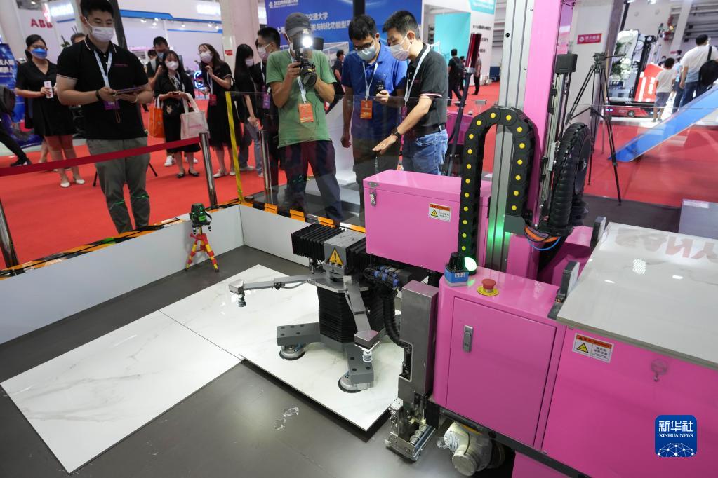 这是在2022世界机器人博览会“机器人+建筑”区域展示的一款地砖铺贴机器人(8月19日摄)。