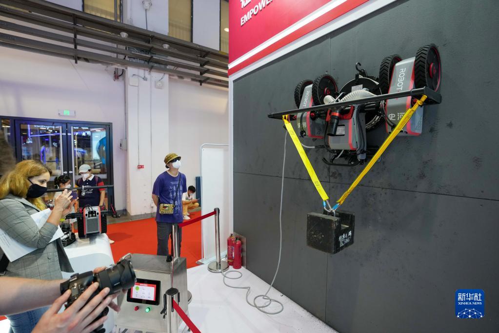 参观者在2022世界机器人博览会“机器人+商用”区域观看一款水射流清理机器人(8月18日摄)。该机器人适用于船体外壳、甲板及内舱等部位的清洗除锈作业。