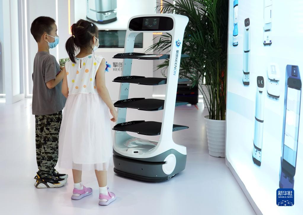 这是在2022世界机器人博览会“机器人+商用”展区现场拍摄的送餐机器人“(8月20日摄)。
