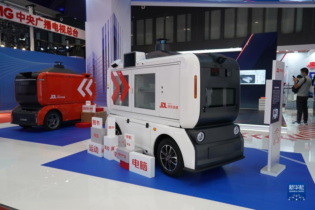 这是在2022世界机器人博览会“机器人+物流”展区现场拍摄的智能零售车(前)(8月18日摄)。