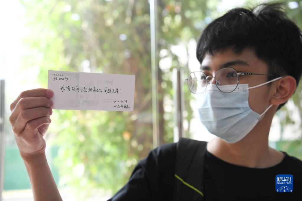 8月21日,中国科学技术大学2022级本科新生陈君旭展示写有学长学姐祝福的明信片。
