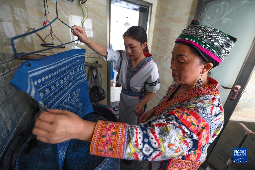 张娟娟(后)与妈妈在家里给蜡染产品染色(8月18日摄)。