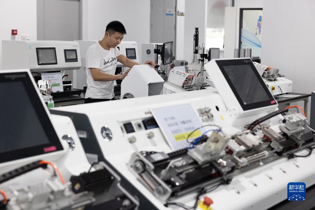 在临港新片区生命科技产业园一处医疗设备生产车间,工人在调试医疗设备(8月18日摄)。