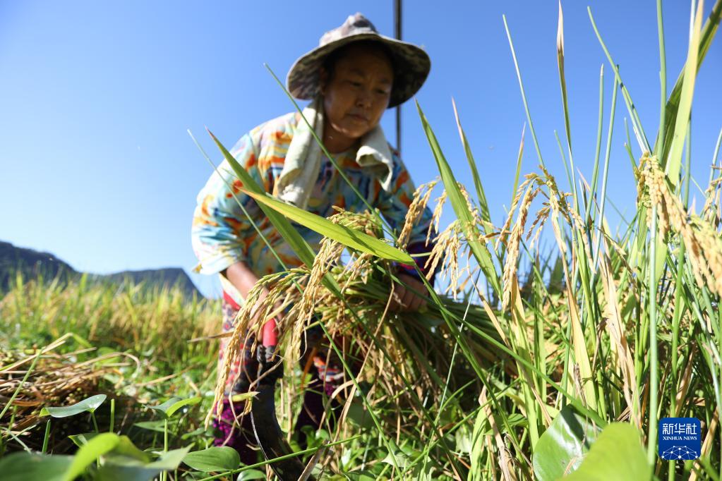 连日来,重庆市持续高温天气,部分地区出现不同程度的旱情。为降低影响,重庆市秀山土家族苗族自治县溶溪镇的农民抓紧有利时机抢收水稻,确保粮食颗粒归仓。
