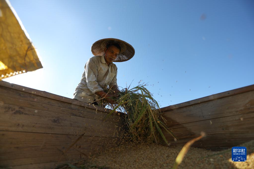 连日来,重庆市持续高温天气,部分地区出现不同程度的旱情。为降低影响,重庆市秀山土家族苗族自治县溶溪镇的农民抓紧有利时机抢收水稻,确保粮食颗粒归仓。