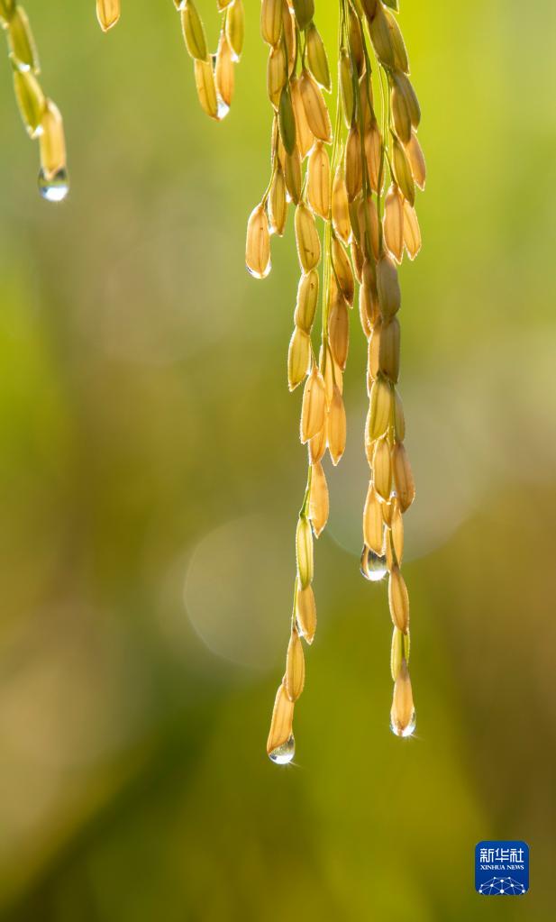 8月20日,在贵州省黔东南苗族侗族自治州从江县刚边壮族乡良田村,颗粒饱满的稻穗上挂着露珠。