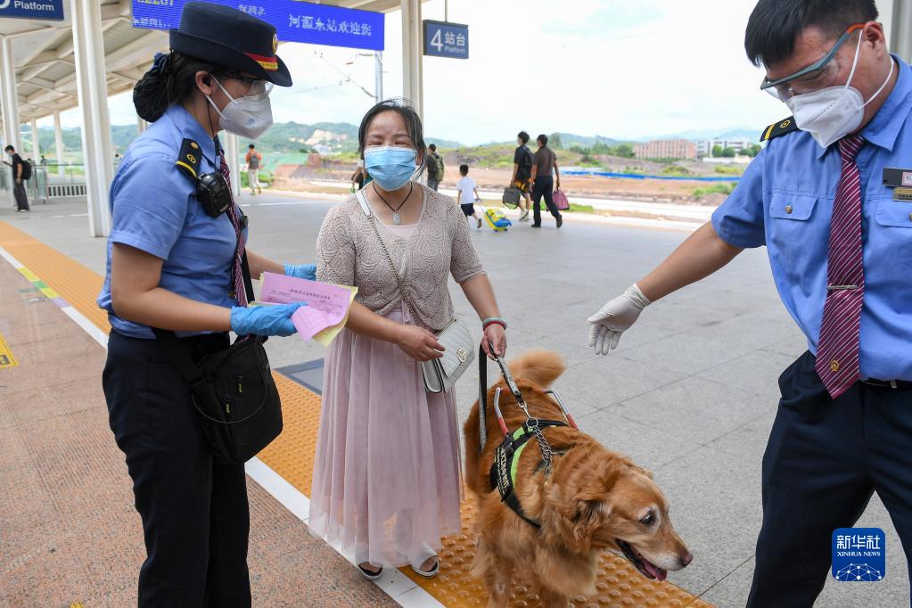 8月19日,在河源东站站台,客运员张金宇(右)与河源东到深圳北的G2267次车列车长李双(左)交接。
