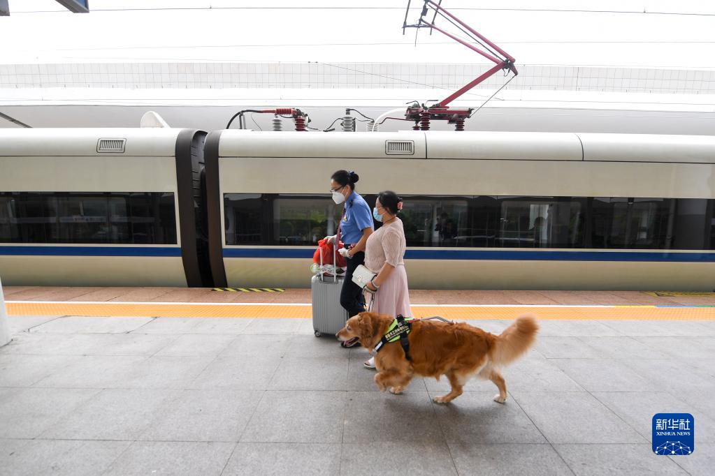 8月19日,在惠州南站,客运员孙丽娜(左)引导张莉和满悦出站。