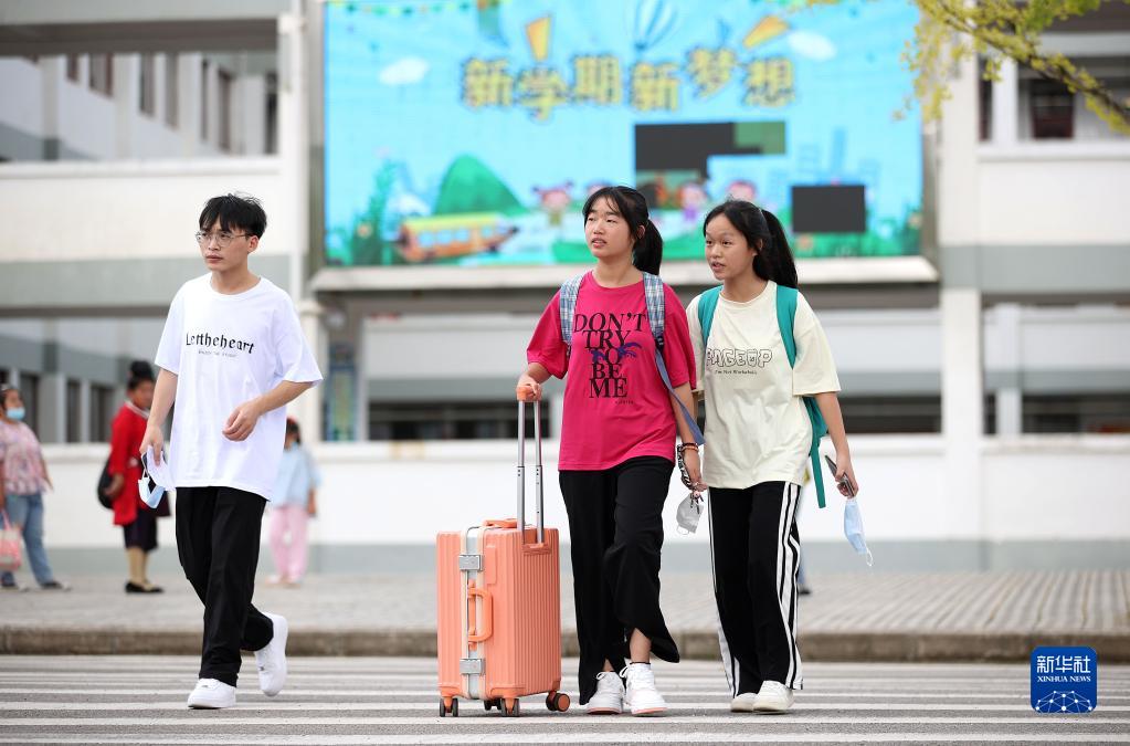 8月22日,贵州省黔东南苗族侗族自治州丹寨县第二中学学生拿着行李走在校园里。