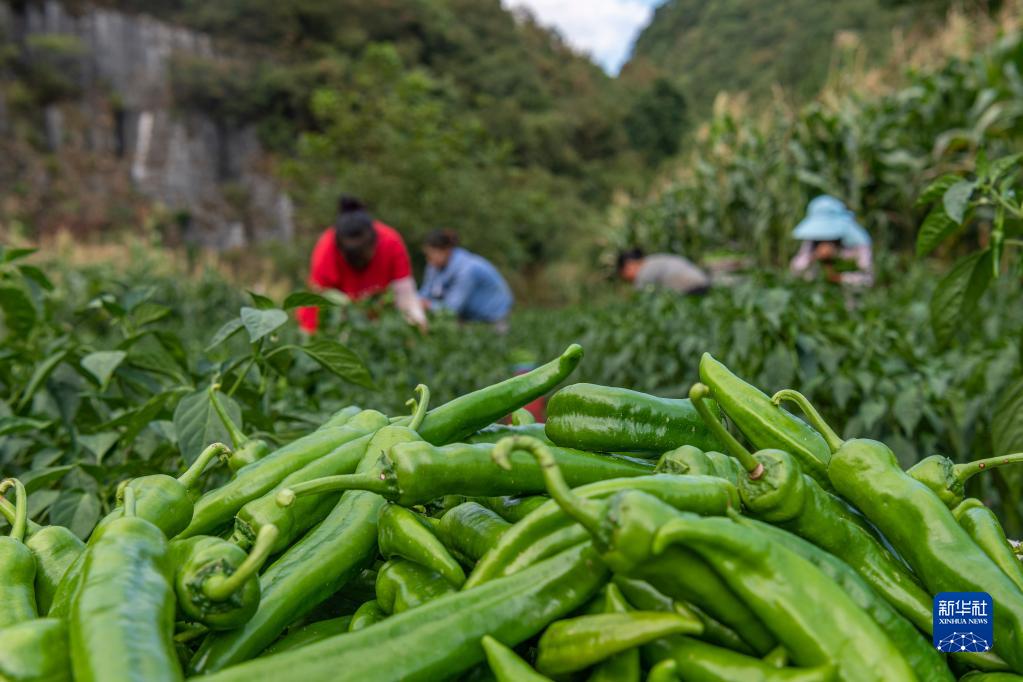 8月22日,在贵州省毕节市百里杜鹃管理区百纳乡龙坪村,村民在采收辣椒。