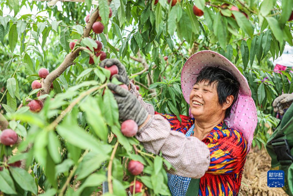 8月22日,在山东省荣成市石岛管理区一处枣油桃种植基地,果农在采摘枣油桃。