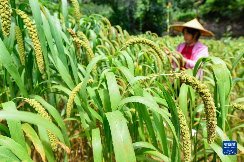 8月22日,在山东省青州市庙子镇一处农作物种植基地,农民在查看谷子成熟情况。