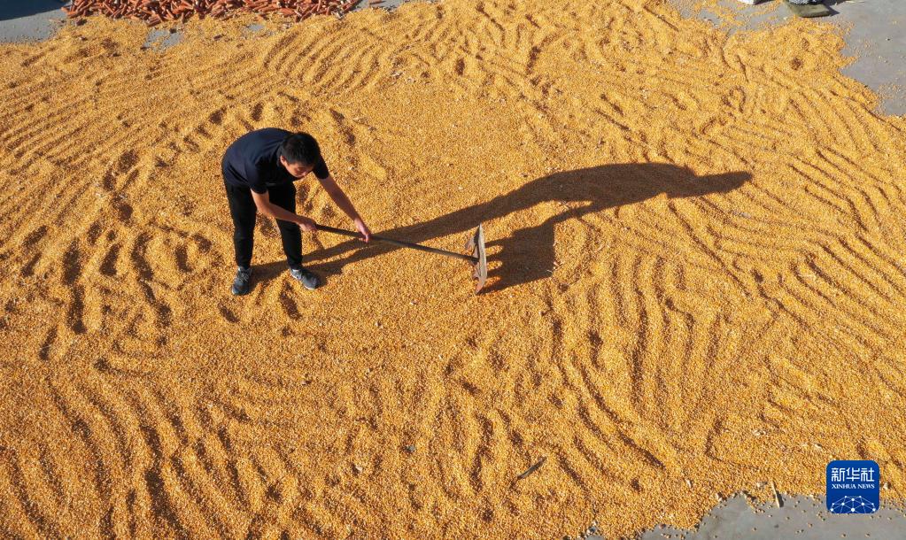 8月22日,河北省玉田县虹桥镇南会村村民在场院晾晒玉米(无人机照片)。