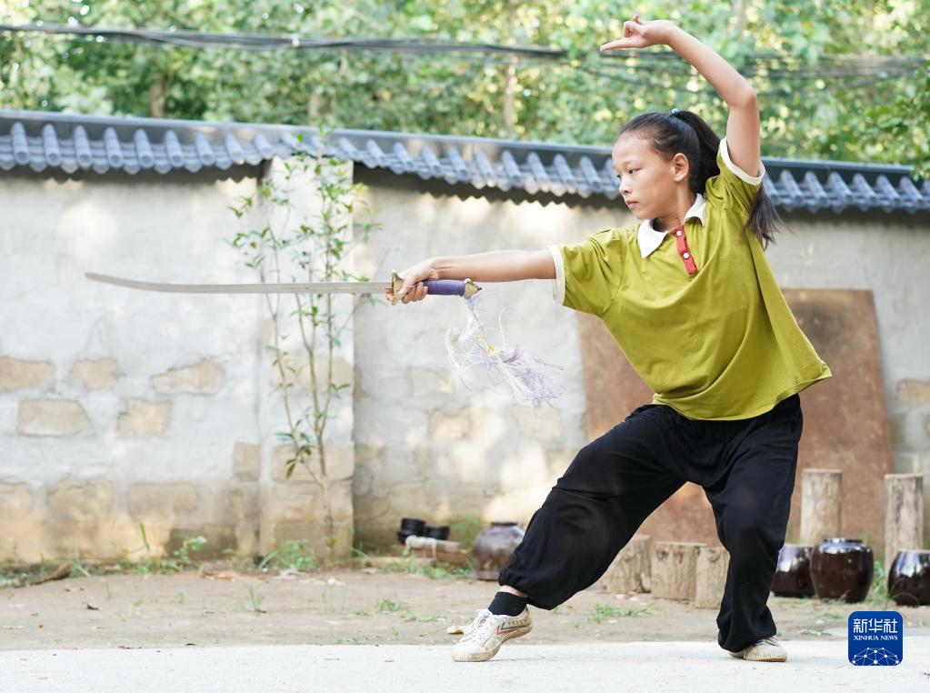 刘龙二女儿刘亦点在展示初级剑(8月16日摄)。
