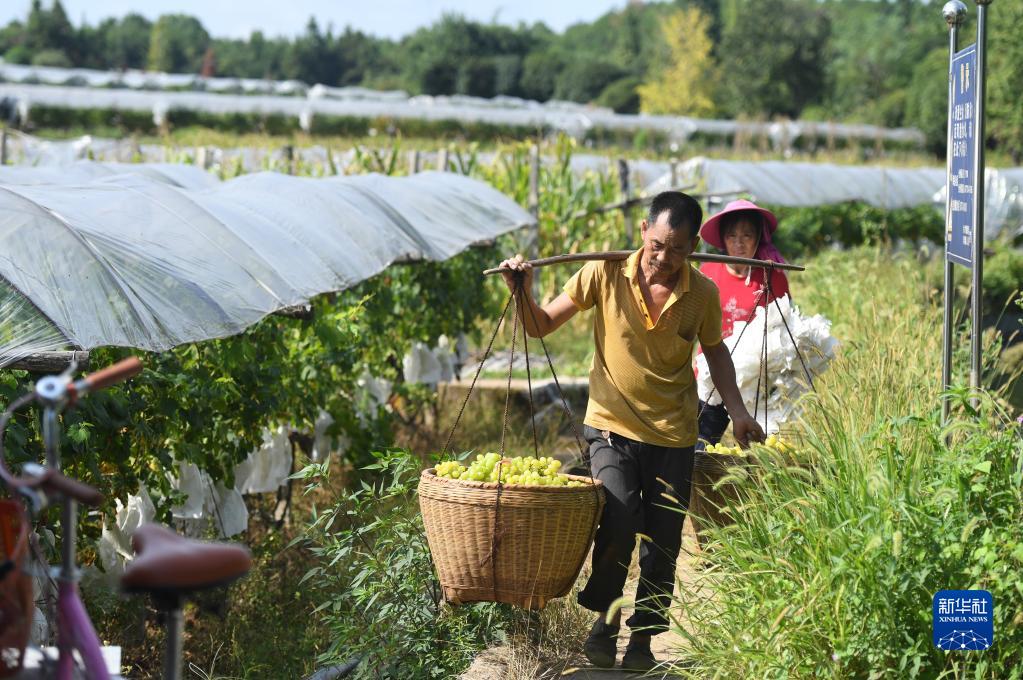 8月23日,在广西全州县才湾镇毛竹山村,当地村民将收摘的葡萄挑出葡萄园。