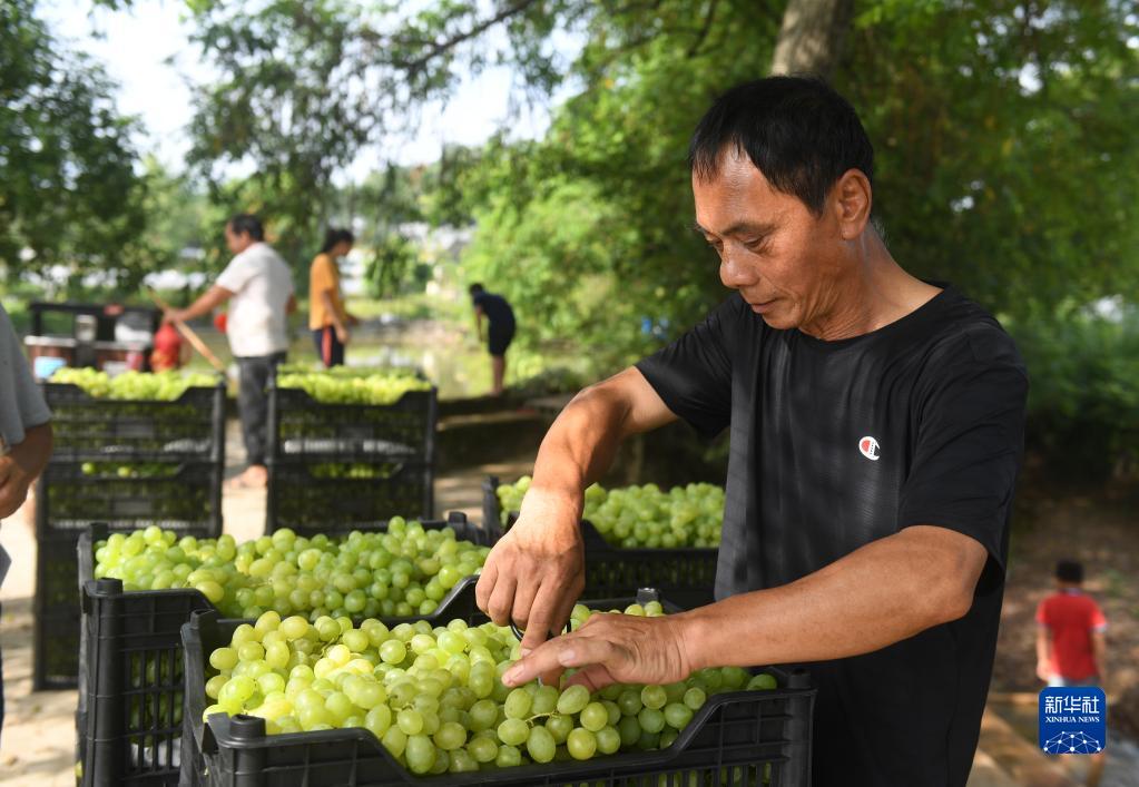 8月23日,在广西全州县才湾镇毛竹山村,当地村民在分拣收摘的葡萄。