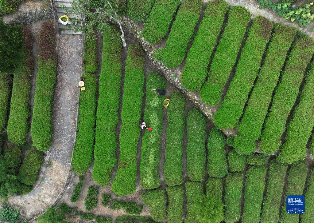 8月23日,湖北省宜昌市秭归县茅坪镇松树坳村村民在茶园采秋茶(无人机照片)。
