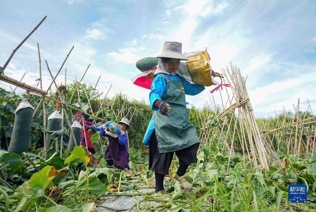 8月23日,村民在贵州省黔东南苗族侗族自治州丹寨县龙泉镇展良村搬运采收的冬瓜。