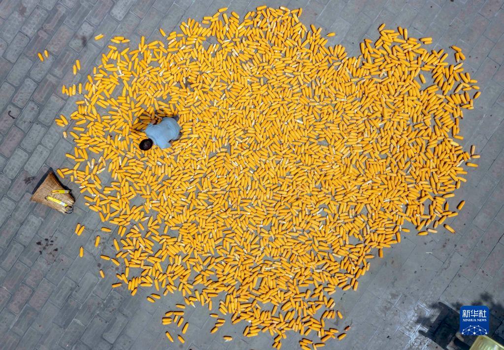 8月23日,村民在贵州省黔西市谷里镇谷兴社区晾晒玉米(无人机照片)。