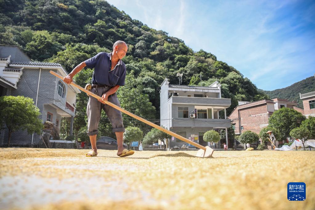 8月23日,湖南省永州市蓝山县祠堂圩镇虎溪村村民在晾晒稻谷。