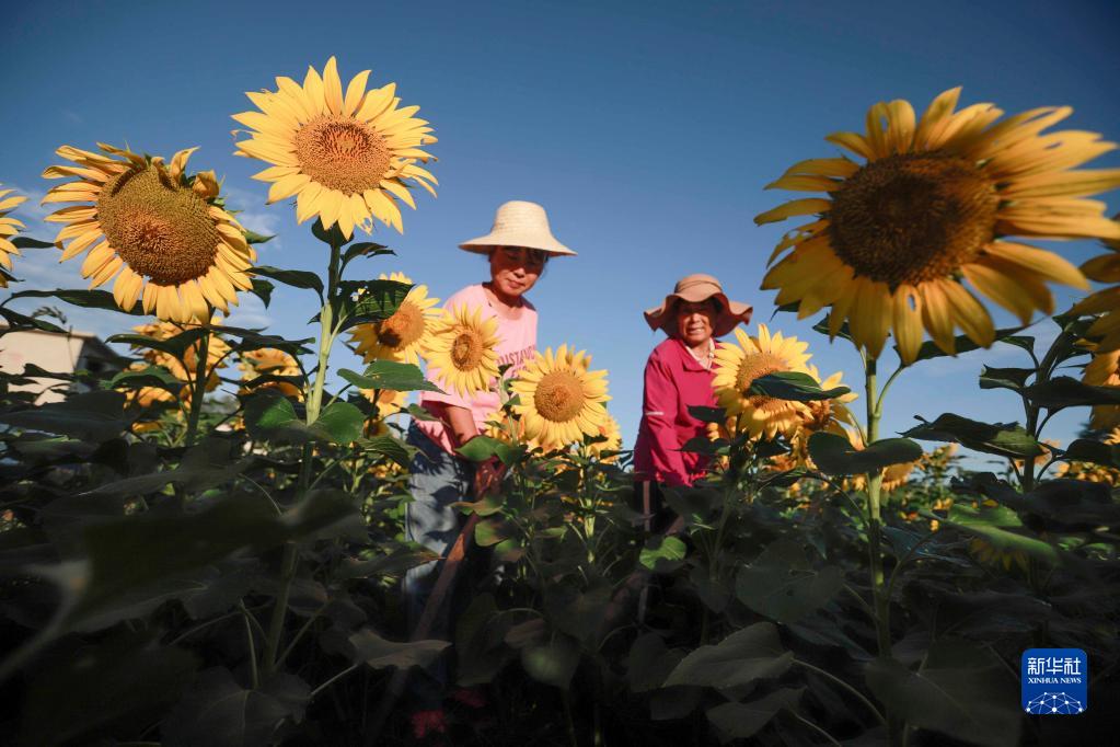 8月23日,河北省遵化市团瓢庄乡山里各庄村村民在田间管护向日葵。