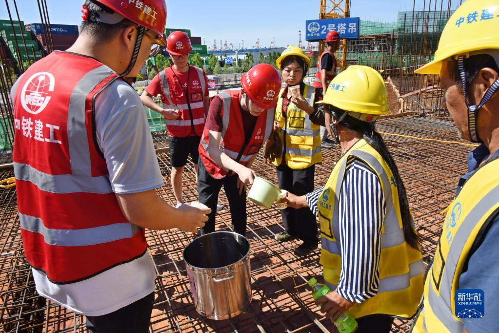 8月23日,青岛自贸全球消费综合体项目部“清凉驿站”的工作人员在工地为建设者送饮料。