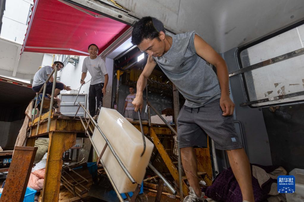 8月16日,上海玉湖制冰有限公司制冰师们接力运送冰块。新华社记者 王翔 摄