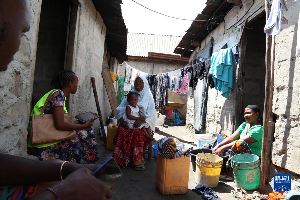 8月23日,人口普查员(左)在坦桑尼亚达累斯萨拉姆进行人口和住房信息调查。