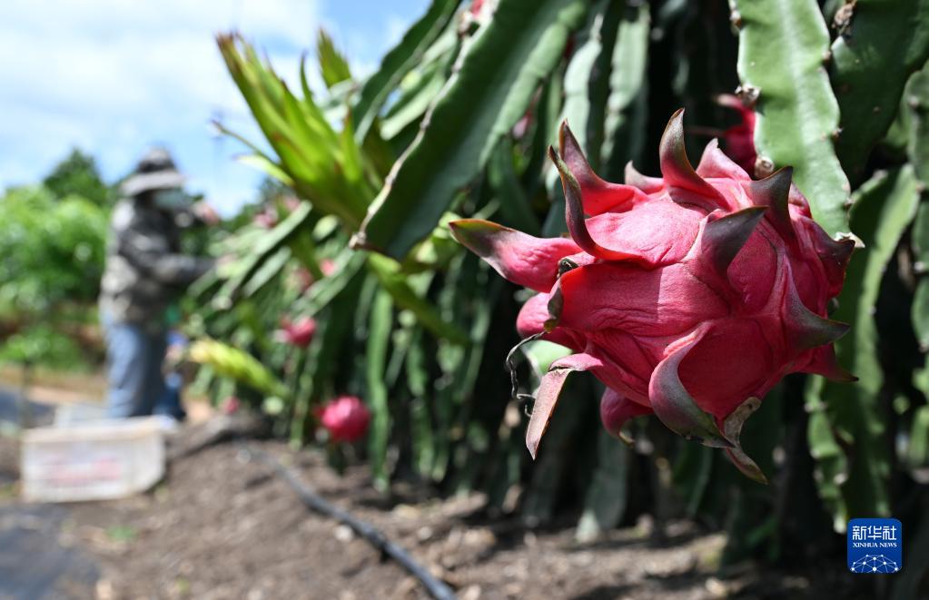 8月24日,村民在三亚市育才生态区马脚村“水果岛”火龙果生产基地采摘火龙果。