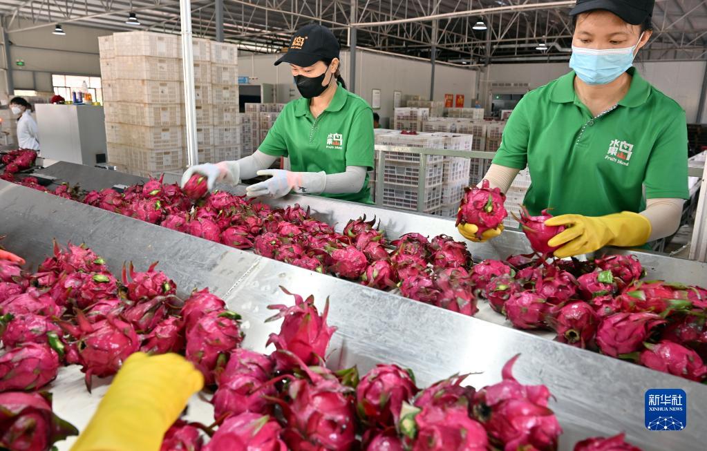 8月24日,村民在三亚市育才生态区马脚村“水果岛”火龙果生产基地分拣火龙果。