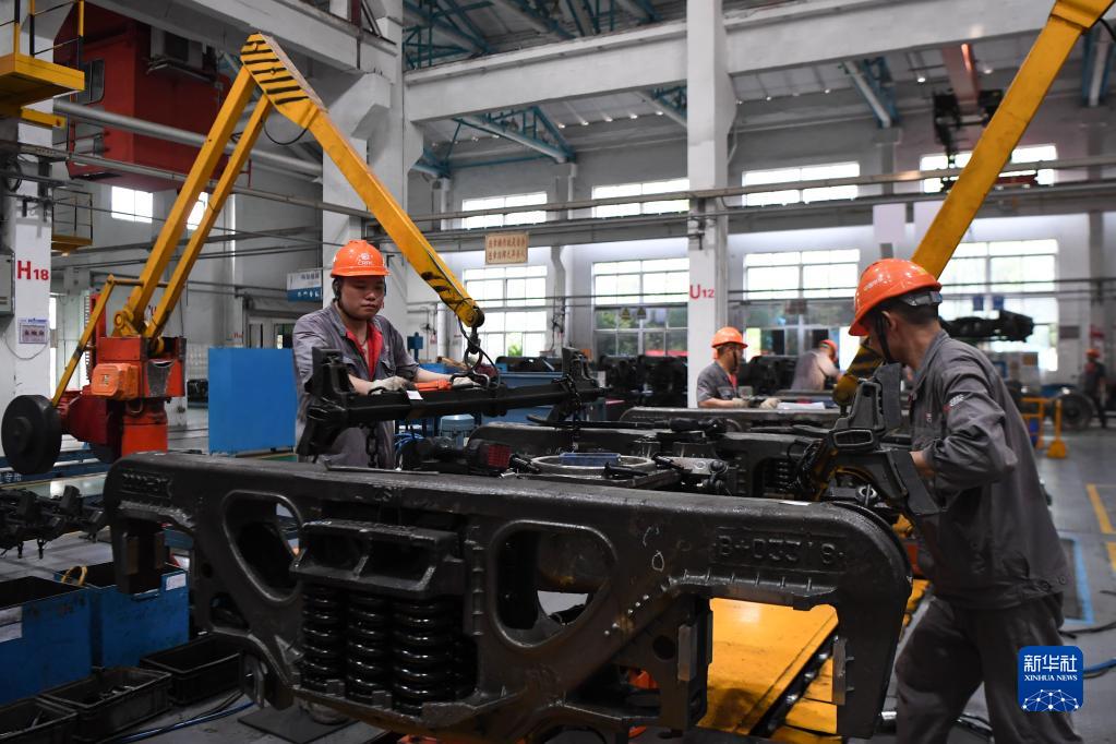 8月24日,在中车株洲车辆有限公司转向架工区,工人在生产线上作业。