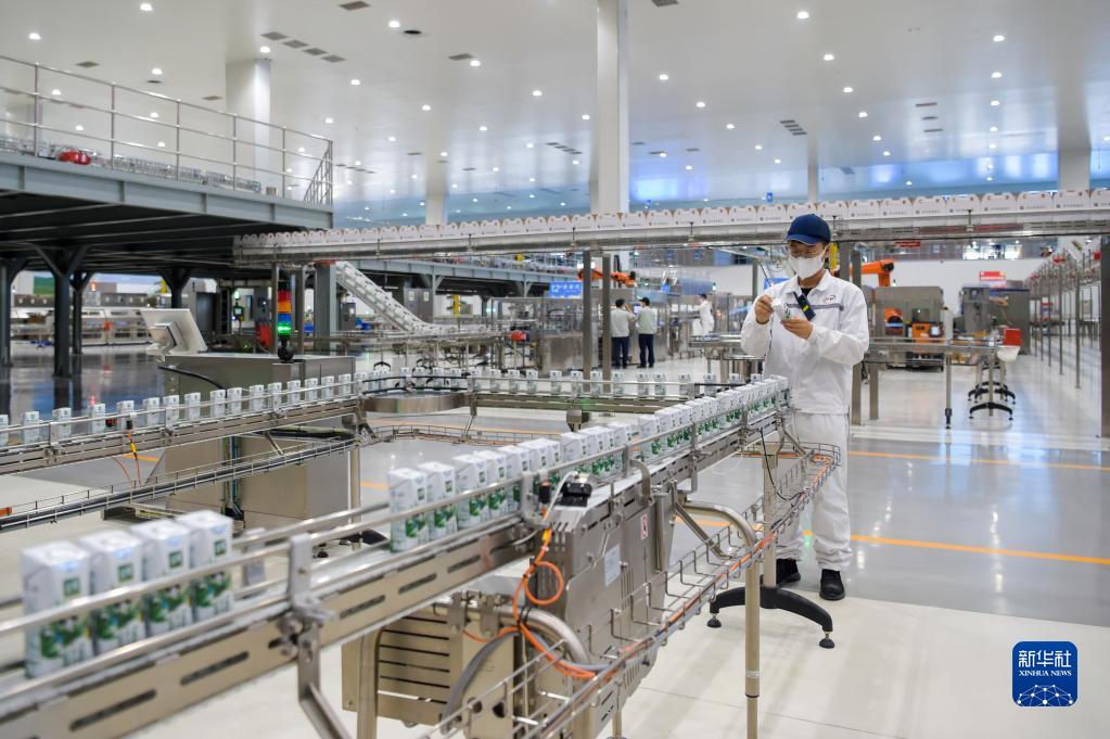 8月25日,在位于呼和浩特市的伊利现代智慧健康谷液态奶全球智造标杆基地,工人在生产线上作业。新华社记者 李志鹏 摄