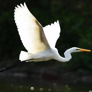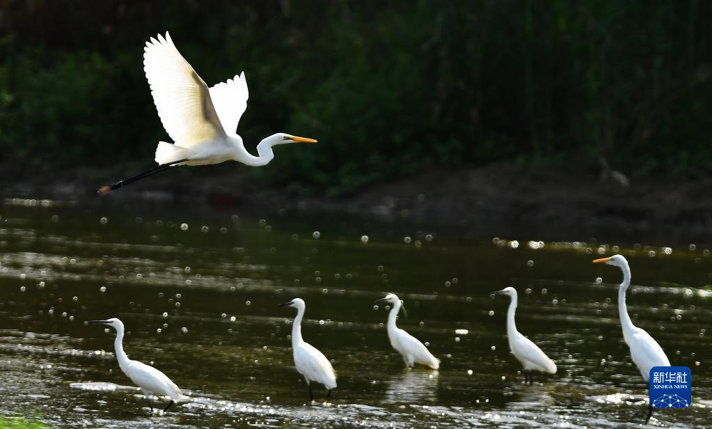 8月27日,白鹭在山东省滕州市的荆河上嬉戏。