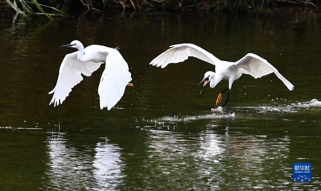 8月27日,白鹭在山东省滕州市的荆河上嬉戏。