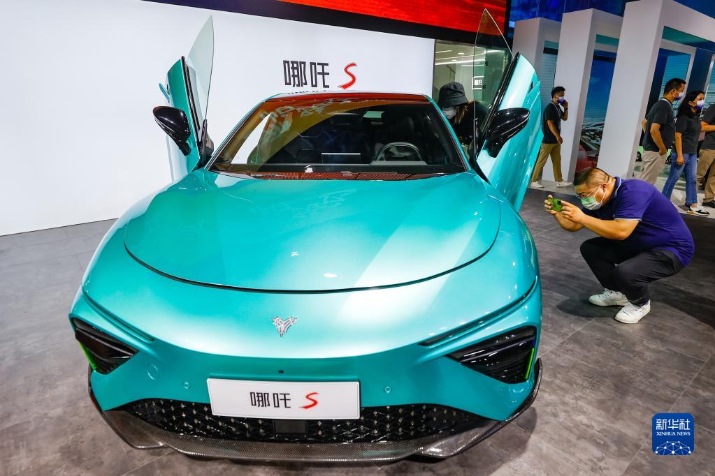 8月26日,在第二十五届成都国际汽车展览会的哪吒汽车展台,参观者在拍摄运动型智享轿跑哪吒S。