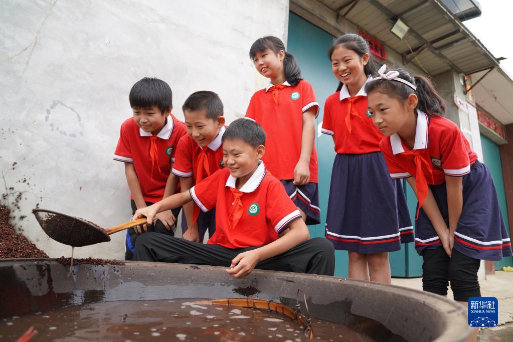 8月27日,河北省邢台市内丘县柳林镇明德小学学生在体验酸枣仁加工技艺。