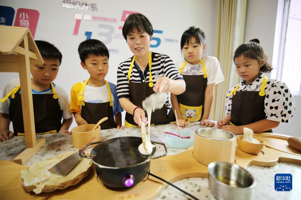8月27日,在山东省临沂市郯城县郯城街道龙泉社区党群服务中心,社区居民教孩子们烙制传统手工煎饼。