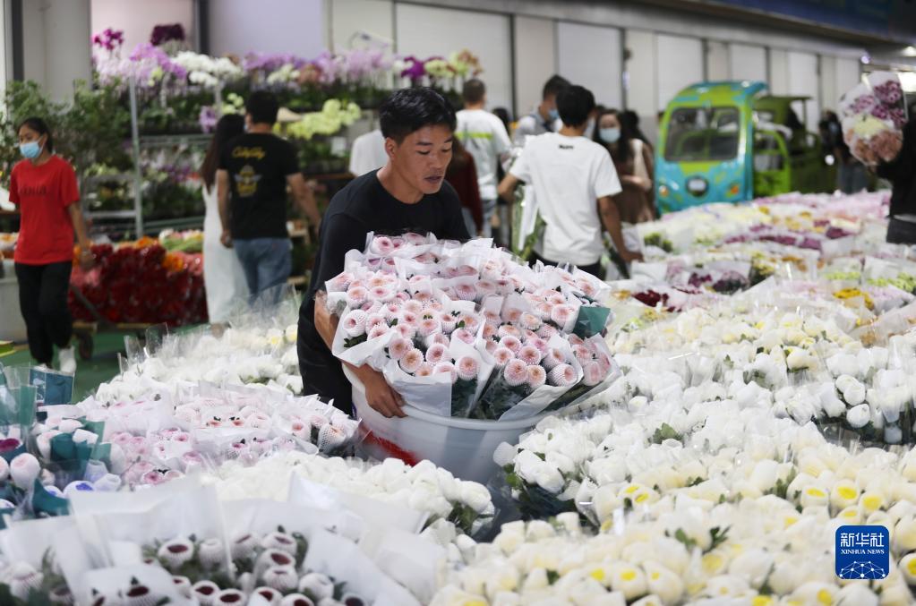 8月27日夜,昆明斗南花卉交易市场的商家在摆放鲜花。