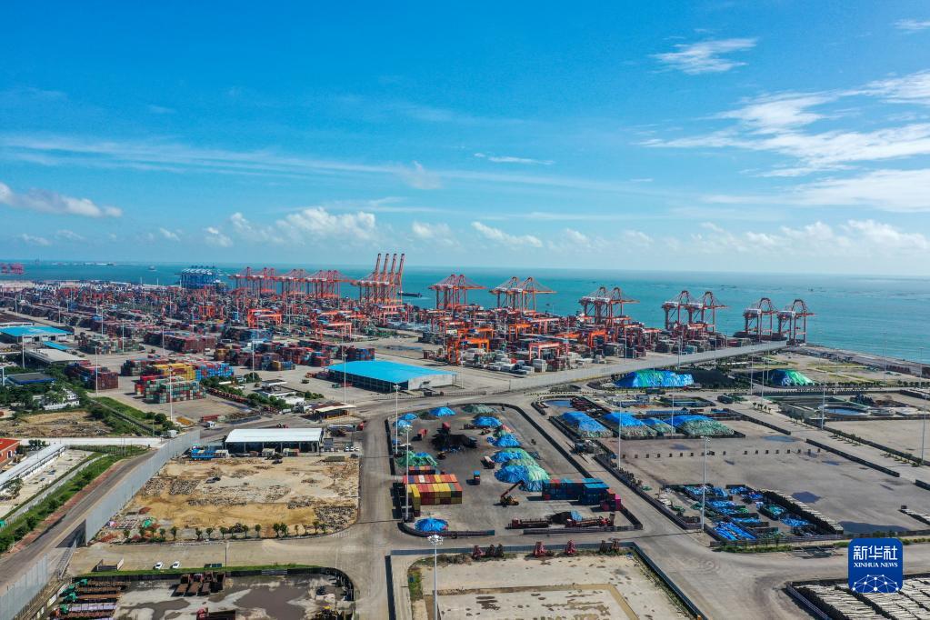 这是8月27日拍摄的位于平陆运河出海口附近的北部湾港钦州港区大榄坪作业区(无人机照片)。