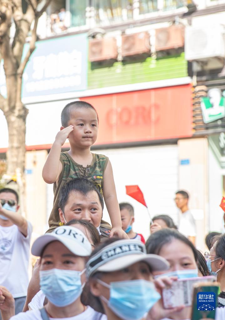 8月28日,在重庆市北碚区,一名小男孩向撤离的森林消防车队敬礼。