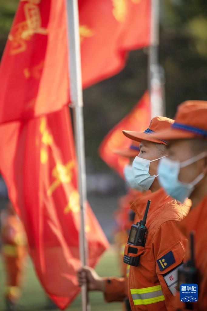 8月28日,在重庆市北碚区,森林消防官兵在撤离前集结。